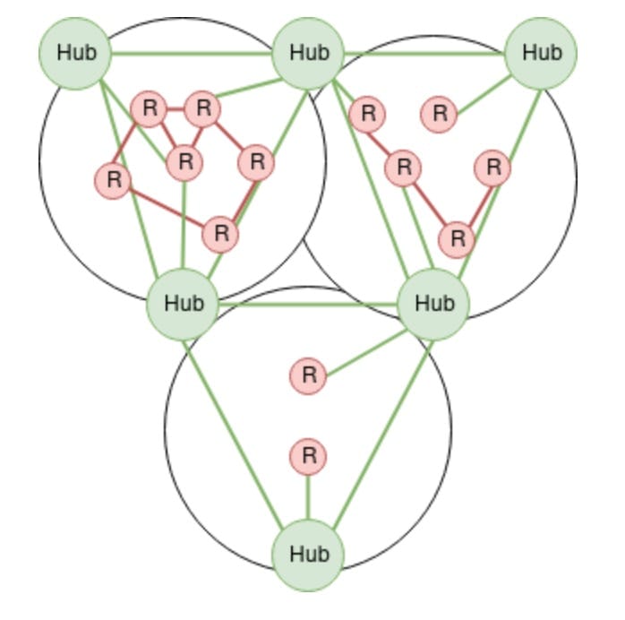 Figure 7: A diagrammatic representation of the internal structure of the mesh network, excludes the supernodes. R = apartment rooftop